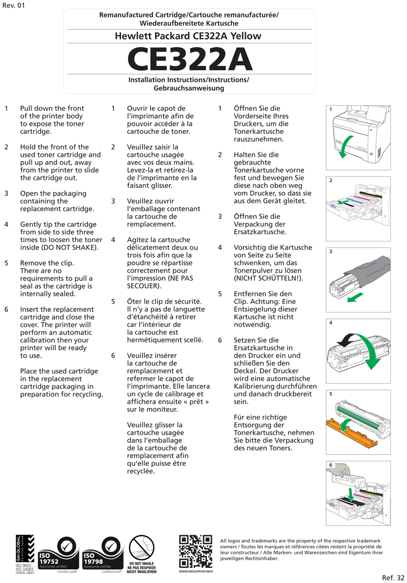 Your cartridge contains very fine powder called ‘toner’. Prior to installation gently rock the cartridge from side to side 2 to 3 times to allow the powder to move into position before printing. You will not need to repeat this process once the cartridge is installed as most cartridges contain a mechanical paddle which agitates the powder during the printing process.