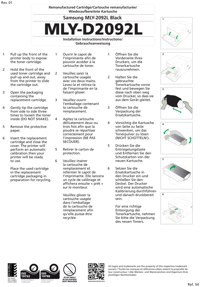 Your cartridge contains very fine powder called ‘toner’. Prior to installation gently rock the cartridge from side to side 2 to 3 times to allow the powder to move into position before printing. You will not need to repeat this process once the cartridge is installed as most cartridges contain a mechanical paddle which agitates the powder during the printing process.